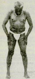 Сначала овладейте уддийяной в положении стоя, как будет описано ниже. Только затем вводите ее в практику Пранаямы, сидя и выполняя бахья кумбхаку (интервал между полным выдохом и началом вдоха). Никогда не делайте уддийяну во время пра-наямы, если вы еще не овладели последней, а также во время анта-ра кумбхаки (задержка дыхания во время интервала между полным вдохом и началом выдоха), так как это вызывает напряжение в сердце а) Станьте в тадасану (фот. 25). б) Поставьте ноги примерно на ширину фута. в) Слегка наклонитесь вперед, согнув при этом колени, растопырьте пальцы рук и захватите ими середины бедер, г) Слегка согните руки в локтях и опустите подбородок насколько возможно в джаландхара бандху, д) Глубоко вдохните и затем быстро выдохните, так, чтобы воздух вытолкнулся из легких со большой скоростью. е) Задержите дыхание, не вдыхая. Подтяните всю абдоминальную область назад, к позвоночнику, и яыншмите ее вверх (фот 66) При выполнении уддийяны трудна я клетка ни в коем случае не должна быть впалой ж) Поднимите поясничный и спинной отделы позвоночника вперед и вверх. Сожмите абдоминальные органы к позвоночнику и надавите ими на него. з) Сохраняйте абдоминальное сжатие, поднимите руки от бедер и расположите их немного выше, по краям тазовых костей для более сильного сокращения. и) Выпрямите спину, не ослабляя при этом абдоминальное сжатие и не поднимая подбородок (фот. 67), к) Сохраняйте сжатие насколько возможно долго, от десяти до пятнадцати секунд Не пытайтесь держать его дольше, чем можете, а постоянно увеличивайте время по мере того, как это становится комфортным л) Сначала расслабьте абдоминальные мышцы, не двигая при этом подбородком и головой. Если они будут двигаться, то вы сразу ощутите напряжение в области сердца и висков. м) Позвольте брюшной полости вернуться в нормальное положение. Затем медленно вдохните (фот. 68). н) Не выдыхайте во время процессов, описанных в пунктах е)-л) о) Сделайте несколько дыханий, затем повторите цикл от а) до л), не больше, чем шесть-восемь раз подряд. Увеличивайте продолжительность сжатия или количество циклов по мере возрастания ваших возможностей или делайте это под личным присмотром опытного учителя или гуру, п) Циклы следует выполнять только один раз в день.