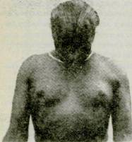 ж) Сохраняйте легкие пассивными и несопротивляющимися во время вдоха для того, чтобы получить и впитать всю поступающую энергию Вдыхая, наполняйте легкие совершенно, с полным вниманием. Синхронизируйте движения дыхания с внутренним расширением легких. з) Как кувшин наполняется от дна до верха, так и легкие наполняются от основания до края, Заполните их до верхушек ключиц и внутренней части подмышек. и) Особое внимание и осторожность необходимы при тренировке слаборазвитых людей, пока их легкие не смогут получать полный объем воздуха Поэтому тщательно исследуйте ваши возможности, с тем чтобы растянуть нервные волокна легких к) Бронхиальные ветви, начинаясь от трахеи, доходят до периферии легких, где разветвляются на множество бронхиол. Следите за тем, чтобы каждый вдох достиг самых кончиков бронхиол. л) Вдыхаемый воздух абсорбируется живыми клетками тела, как вода абсорбируется почвой. Чувствуйте эту абсорбцию и следующее за ней воодушевляющее ощущение просачивания космической энергии (праны). м) Энергия вдоха входит через нос и достигает причинной оболочки духовного тела. При вдохе сознание (читта) восходит от пупка (манипура чакры) к верхушке груди (вишуддхи чакре). Сад-хака должен поддерживать всеобъемлющий объединяющий контакт между причинной и тонкой оболочками тела (см. гл. 2) и сознанием, восходящим из своего источника. Этот контакт объединяет тело, дыхание, сознание и Самость Затем тело (кшетра) и Атма (кшетраджна) становятся единым целым. н) Каждая пора кожи туловища должна действовать как око разума (джнана чакшу) для абсорбции. о) Если вдох слишком четко выражен, на коже ладоней возникает ощущение твердости Регулируйте дыхание таким обра зом, чтобы кожа ладоней все время сохраняла мягкость. п) Если во время вдоха плечи поднимаются, верхняя часть легких не будет полностью расширяться и задняя часть шеи будет испытывать напряжение. Наблюдайте эту тенденцию восходящего движения и немедленно опускайте плечи (фот. 52). Чтобы сохранить их опущенными, а грудную клетку поднятой, используйте шест или отягощения, как показано на фот 71 74.