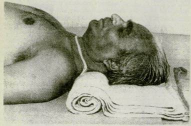 Напряженным и беспокойным людям следует положить тяжелые предметы (около 20 кг) на бедра и менее тяжелые (около двух килограмм) на ладони (фот. 184) Они должны также сделать самукхи мудру (фот. 185) или свернуть длинный мягкий и тонкий кусок ткани примерно в три дюйма шириной, расположить его вокруг головы и накрыть глаза и виски. Начните с бровей, не закрывая носа; подогните концы ткани на висках сверху или по бокам носа внизу Ткань не должна прилегать к телу ни слишком плотно, ни слишком свободно (фот. 186) Когда мозг активен, движения висков и напряжение в глазных яблоках будут сдвигать ткань наружу Когда кожа расслаблена, вы не будете чувствовать контакта с тканью в этих местах Это означает, что мозг на пути к расслаблению. Людям, страдающим болями в шее из-за цервикального спондилита или растяжения связок, будет трудно растянуть заднюю сторону шеи и удобно себя чувствовать. Они должны расположить полотенце или свернутую ткань между основанием шеи и черепом, как показано на фотоилюстрациях 187 и 188. Очень нервным людям или людям, страдающим от недостатка уверенности, следует лечь в шавасану, направляя взгляд на среднюю точку между бровями (тратака) (фот. 149), закрыть глаза и смотреть внутрь себя (фот. 150). Им следует дышать глубоко, задерживая дыхание на одну-две секунды после каждого вдоха. Им следует практиковать шавасану только после выполнения сарван гасаны, которая описана в книге «Взгляд на Йогу». Глубокий вдох и выдох дают возможность таким людям расслабиться, после чего они уже не будут нуждаться ни в сосредоточении взгляда на точке между бровями, ни на концентрации на глубоком дыхании Если зазор между полом и поясницей слишком велик, ясно льзуите мягкую подушку или свернутое одеяло, чтобы заполнить его, Такая поддержка дает отдых пояснице (фот, 189). Людям, страдающим болями в спине, следует положить грузы (10- 20 кг) на абдоминальную область Это облегчит боль (фот 190) Эффект В правильной шавасане минимально расходуется энергия и максимально восстанавливаются силы. Это освежает все сущест-во, делая человека подвижным и творческим Это изгоняет страх (мерти убхайя) и порождает бесстрашие (абхайя). Садхака испытывает состояние спокойствия и внутреннего единсгва.