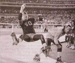 Подпись к этому снимку, появившемуся в журнале «Life» в 1973 г., гласила: «В Нью–Йорке падение становится проявлением грации. Глаза вылезают из орбит, восемь колес и десять пальцев загребают воздух. Чарли О'Коннел из «Сан–Франциско Бэй Бомбер» принимает такую фантасти- ческую позу, принять которую боится самый отчаянный участник гонок на роликовых коньках