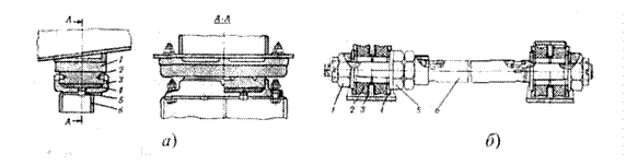 Рисунок 2.3 - Рессорное подвешивание тележки: а — буксовая ступень; б — центральная ступень Центральная ступень подвешивания оборудована люлькой, состоящей из двух параллельных комплектов, на которых расположена надрессорная балка 15. Каждый комплект включает две трёхрядные пружины 13, опирающиеся через прокладку 10 на поддон 12, подвешенный шарнирно к продольным балкам рамы посредством серёг 4 и подвесок (тяг) 3. Благодаря шарнирной опоре и радиальной поверхности верхней проушины подвесок 3 люлька может качаться через валик 2 поперёк и вдоль вагона, создавая плавное отклонение кузова. На случай обрыва подвесок 3 или серёг 4 предусмотрены предохранительные болты 9 с Т-образными головками, опирающимися вверху через резиновую прокладку 6 на продольные балки рамы. На их нижние концы навёрнуты гайки 11. От падения надрессорная балка защищена предохранительной скобой 14, а от её перекоса и смягчения продольных ударов, возникающих при прохождении кривых участков пути, каждый конец балки связан с рамой тележки упругим продольным поводком 1. Центральное подвешивание снабжено гидравлическими гасителями колебаний 7, размещёнными с каждой стороны тележки и шарнирно укреплёнными верхними концами к кронштейнам 5 боковых рам, а нижними — к кронштейнам 8 надрессорной балки. Расположенные под углом 35-45° к горизонтали, они способны гасить вертикальные и горизонтальные колебания надрессорной балки и кузова вагона. Опора кузова на тележку (рисунок 2.4, а) состоит из скользунов кузова 1 и тележки 2, взаимодействующих между собой. Скользун 2 через резиновую прокладку 4 опирается на дно коробки 3, укреплённой болтами к опоре 6 надрессорной балки, где она центрируется с помощью штыря 5. Такая опора повышает плавность хода вагона за счёт уменьшения боковой качки и гашения извилистого движения тележки. При этом момент трения между скользунами должен находиться в пределах 20—28 Н-м, обеспечивающий поворот тележки относительно кузова при прохождении вагона в кривых участках пути. Это достигается применением разнородных материалов: для скользуна кузова 7 применена сталь марки 40Х, а для тележки 2 скользун выполнен из серого чугуна СЧ 23-40. С целью недопущения задиров рабочие поверхности скользунов шлифуют и смазывают. Подобная конструкция опоры потребовала применения дополнительного устройства — направляющего упругого поводка (рисунок 2.4, б), предназначенного для упругого ограничения горизонтального перемещения надрессорной балки и возвращения её в центральное положение. Он состоит из трубчатой тяги 6 с левой и правой цапфами на концах, резиновых пакетов 2, заключённых между тарелей 3 и шайб 4. Зазоры между вертикальными продольными скользунами надрессорной и поперечными балками регулируют при помощи гаек 1 и 5 в пределах запаса резьбы на левой цапфе тяги 6.