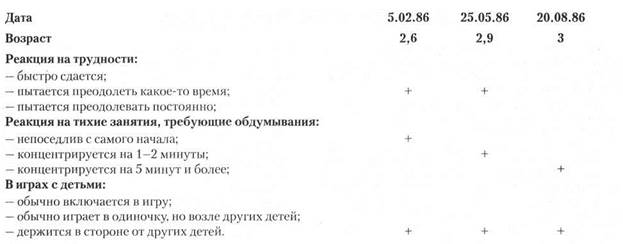 Фрагмент карточки развития, фиксирующей поведение ребенка 3. Воздерживайтесь от оценочных суждений. Например, можно сказать: «Петя капризничает, потому что мама не задерживается с ним, когда приводит его в детский сад» (в высказывании содержится скрытый упрек матери). А можно и так: «Кажется, Петя быстрее успокаивается в те дни, когда маме удается задержаться с ним на несколько минут». Можно порекомендовать и родителям вести такие карточки наблюдения. Значимая информация может быть извлечена из беседы с ребенком, которую обычно рекомендуют при работе с детьми в возрасте от 6 до 15 лет. По мнению Н. А. Русиной и В. А. Урываева, темами для беседы могут быть: — семья: ее члены и отношения между ними, терпимость, предпочтения, интимность, доминантность, зависимость, агрессия, интенсивность—экстенсивность и активность—пассивность отношений, ревность, зависть, конфликт и т. д.; — родители: воспитательные методы и родительские позиции, взгляды, интересы, перспективы ребенка; — участие в домашней работе: ее содержание, систематичность и самостоятельность; — свободное время: количество и качество проведения, под присмотром родителей, спонтанное или в группе; друг противоположного пола; интересы, увлечения; — самооценка: общая самооценка, внешний вид, способности; надежды, идеалы; удовлетворенность собой, ожидания; — школа: ход обучения, как оно протекает, смена школы, привязанность к школе. Учеба: успеваемость, поведение, предпочитаемые предметы, отношение к экзаменам (уровень напряжения). Уровень притязаний. Одноклассники: статус в классе, друзья и враги, взаимоотношения. Учителя: восприятие учеником отношения учителей к себе и другим ученикам, степень популярности, наличие конфликтов; — страхи и опасения: наличие и объекты страхов, ночные страхи) — состояние здоровья: хронические заболевания, самооценка состояния здоровья (Русина Н. А., Уры-ваев В. А., 1998). По результатам наблюдения и беседы с ребенком можно сделать обоснованные заключения о его психологических особенностях. При этом следует дать оценку темперамента ребенка и его характера. Оценивая характер, обращайте внимание на отношения ребенка к другим людям, сверстникам, взрослым, к делу, к самому себе. Другая группа методов изучения ребенка — это эксперимент. Для врача и педагога наиболее приемлемой формой эксперимента может стать исследование с помощью тестов. Тест — это стандартизированное задание для определения развития у ребенка различных психических процессов. К положительным сторонам тестирования обычно относят: — возможность определения нормы развития; — возможность проведения повторных, т. е. сравнительных испытаний; — возможность одномоментного сбора большого объема материала; — отсутствие длительной специальной подготовки. В то же время у тестов есть свои недостатки, ограничивающие их применение. Детская и возрастная психология богата разнообразными тестовыми процедурами. Среди них немало надежных, хорошо зарекомендовавших себя. Однако чаще всего практически применимыми могут быть только экспресс-методики. Они просты в употреблении, не требуют длительной обработки данных, сложного и развернутого анализа полученных сведений.