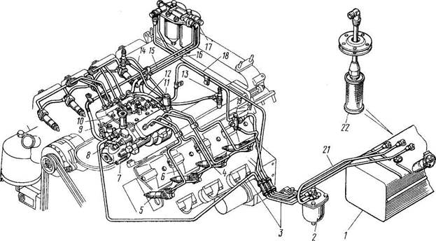 Рис. 35. Схема питания двигателя топливом: 1 - бак топливный; 2 - фильтр грубой очистки топлива; 3 - трубка топливная подводящая к насосу низкого давления; 4 - трубка топливная дренажная форсунок левых головок; 5 - форсунка; 6 -трубка топливная высокого давления; 7 - насос топливоподкачивающий низкого давления; 8 - насос топливоподка-чивающий ручной; 9 - трубка топливная отводящая насоса низкого давления; 10 - насос топливный высокого давления; 11 - клапан электромагнитный; 12-трубка топливная к электромагнитному клапану; 13 - свеча факельная; 14 - трубка топливная дренажная форсунок правых головок; 15 - трубка топливная подводящая ТНВД; 16 - трубка топливная отводящая ТНВД; 17 - фильтр тонкой очистки топлива; 18 - трубка топливная фильтра тонкой очистки топлива; 19 - тройник крепления топливных трубок; 20 - трубка топливная сливная; 21 - топливопровод к фильтру грубой очистки; 22 - труба приемная с фильтром