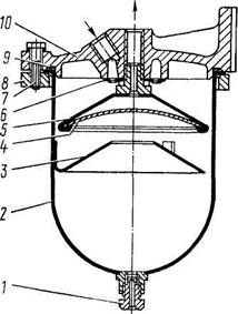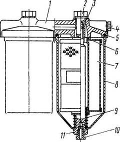 Рис. 36. Фильтр грубой очистки топлива: 1 - пробка сливная; 2 - стакан; 3 - успокоитель; 4 - сетка фильтрующая; 5 - отражатель; 6 - распределитель; 7 - болт: 8 -фланец; 9 - кольцо уплотнительное; 10 - корпус Рис. 37. Фильтр тонкой очистки топлива: 1 - корпус; 2 -болт; 3 - шайба уплотнительная; 4 - пробка; 5, 6 -прокладки уплотнительные; 7 - элемент фильтрующий; 8 - колпак; 9 - пружина фильтрующего элемента; 10 - пробка сливная; 11 - стержень Раздел II. Сборочные единицы и системы силового агрегата