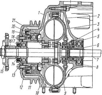 Рис. 61. Насос водяной: 1 - шкив; 2 - болт; 3, 10 - шайбы; 4, 6 - подшипники; 5 - пресс-масленка; 7 - манжета; 8 -кольцо уплотнительное с обоймой; 9 - валик; 11- гайка колпачковая; 12 - кольцо упорное; 13 - уплотнение (сальник); 14 - крыльчатка; 15 - кольцо стопорное; 16 -пылеотражатель жалюзи следует при прогревании двигателя, а также при движении в случае понижения температуры охлаждающей жидкости. Жалюзи радиатора предназначены для регулирования потока воздуха, прокачиваемого через решетку радиатора. Они выполнены в виде набора горизонтальных пластин из оцинкованного железа, объединены общей рамкой и снабжены шарнирным устройством, обеспечивающим одновременный поворот их около осей. Жалюзи прикрепляют к каркасу радиатора перед охлаждающей решеткой. Вентилятор — осевого типа, пятилопастный, установлен на ведомом валу гидромуфты. Вентилятор вращается в установленном на рамке радиатора диффузоре, который уменьшает подсос лопастями воздуха с боков и тем самым способствует увеличению потока воздуха, просасываемого вентилятором через радиатор. Бачок расширительный установлен на двигателе с правой стороны по ходу автомобиля и соединен с коробкой термостатов, верхним бачком радиатора и компрессором. Расширительный бачок служит для компенсации изменения объема охлаждающей жидкости при ее расширении от нагревания, а также позволяет контролировать степень заполнения системы охлаждения и способствует удалению из нее воздуха и пара. В горловине расширительного бачка установлена паровоздушная пробка 21 (см. рис. 56) с впускным (воздушным) и выпускным (паровым) клапанами. Выпускной клапан, нагруженный пружиной, поддерживает в системе охлаждения избыточное давление до 56, 9... 78, 5 кПа (0, 58... 0, 80 кгс/см2), впускной клапан, нагруженный более слабой пружиной, препятствует созданию в системе разрежения при остывании двигателя. Впускной клапан открывается и сообщает систему охлаждения с атмосферой при разрежении 0, 98... 12, 7 ê Ï a (0, 01... 0, 13 ê ã ñ /ñ ì 2). Охлаждающая жидкость заливается в двигатель через горловину расширительного бачка. Уровень жидкости в расширительном бачке контролируется краником 19 контроля уровня, который должен находиться выше крана контрольного уровня, при этом верхний уровень жидкости в бачке должен быть 1/2...2/3 â û ñ î ò û á à ÷ ê à. Контроль за температурой охлаждающей жидкости в системе осуществляется указателем на щитке приборов. При возрастании температуры в системе охлаждения до 98 " С в указателе загорается контрольная лампа аварийного перегрева охлаждающей жидкости.