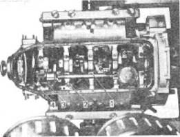 Рис. 98. Вид двигателя снизу со снятым масляным картером: 1 - трубка всасывающая; 2 - трубка подводящая клапана системы смазывания; 3 - насос масляный; 4 -шестерня ведомая привода масляного насоса