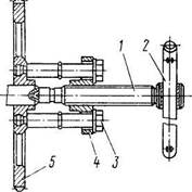 Рис. 99. Снятие ведомой шестерни привода масляного насоса съемником 11801.02.000: 1 - винт; 2 - рукоятка; 3 - болт; 4 - траверса; 5 - шестерня торец вала. Вращая рукоятку, вверните винт в траверсу до полного снятия шестерни; — выверните болты крепления нагнетающей и — замерьте радиальный и торцовый зазоры на — при сборке насоса не допускайте повторное — испытайте насос с использованием моторного — проверьте клапаны насоса на давление начала Автомобили КамАЗ