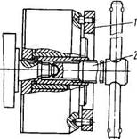 верку производите на летнем дизельном топливе при температуре его 25... 30°С, в отсутствии воздуха в системе убедитесь по чистоте струи топлива в прозрачных трубопроводах. Насос должен засасывать топливо из бака, установленного на 1 m ниже насоса. Подача насоса при частоте вращения кулачкового вала 1290... 1310 мин1, разрежении у входного штуцера 22, 6 1кПа (170 мм рт. ст.) и противодавлении 58, 8...78, 5 ê Ï a (0, 6... 0, 8 ê ã ñ /ñ ì 2) ä î ë æ í à á û ò ü í å менее 2, 5 л/мин. При полностью перекрытом выходном кране и частоте вращения кулачкового вала 1290... 1310 мин" 1 насос должен создавать давление не менее 392 кПа (4 кгс/см2). При полностью перекрытом входном кране и указанной частоте вращения кулачкового вала минимальное разрежение, создаваемое насосом, должно быть 50, 6 кПа (380 мм рт. ст.); — ручной топливоподкачивающий насос про Для снятия автоматической муфты опережения впрыскивания топлива используйте приспособление И801.16.000. Сначала отверните гайку 2 (рис. 102) крепления муфты. Для этого вставьте отвертку 4 в паз гайки и, удерживая муфту 1 от вращения, ключом 3 отверните гайку. Затем, вворачивая в муфту съемник 2 (рис. 103), снимите муфту. Для разборки муфты: — выверните винты из корпуса и слейте масло; — зажмите в настольные тиски подставку 6 (рис. — ключом 1 отверните корпус 5 (см. рис. 43); — снимите ведущую полумуфту 1 с проставками — выпрессуйте манжеты 4 и 2. Учитывая, что грузы подобраны по статическому