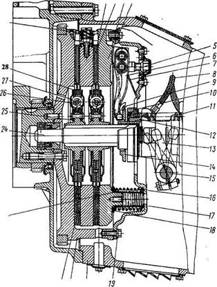 Модель............................................. 142 Тип.................................................... ô ð è ê ö è î í í î å, ñ ó õ î å, ä â ó õ Í.ì (ê ã ñ.ì)..................................... 833 (85) Число трущихся поверхностей.... 4 Диаметр фрикционных накладок, мм: наружный....................................... 350 внутренний................................... 200 Толщина ведомого диска с í à ê ë à ä ê à ì è, ì ì........................... 11 Толщина í à ê ë à ä ê è, ì ì................... 4, 5 Количество нажимных пружин... 24 Усилие пружин при включенном ñ ö å ï ë å í è è, Í (ê ã ñ)....................... 13150...15300 (1315...1530) Усилие пружин при выключен Количество оттяжных рычагов нажимного ä è ñ ê à.......................... 4 Передаточное число оттяжных рычагов.......................................... 4 85 Гаситель крутильных колебаний. ПружИнно-фрикционного типа Привод сцепления........................... гидравлический, с пнев Автомобили КамАЗ