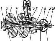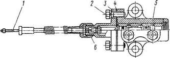 Рис. 144. Кран управления делителем передач: 1 - трос крана с золотником: 2 - болт; 3 - крышка корпуса крана; 4 - прокладка уплотннтельная; 5 - корпус крана; 6 -гайка соединительная