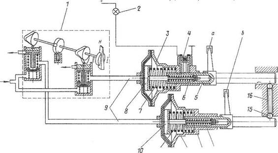 Рис. 157. Схема пневмосистемы управления раздаточной коробкой: 1 — кран переключения передач; 2 — сигнализатор включения низшей передачи; 3, 12 — механизмы переключения передач: 4 — выключатель сигнализатора включения низшей передачи; 5, 14 — штоки; 6, 13 — нажимные пружины; 7, 11 - возвратные пружины; 8, 10 — стаканы; 9 — пневмопроводы; 75 — шарик; 16 — штифт; а —к муфте 41 (см. рис. 155), b — к муфте 28 (см. рис. 155) Переключение передач в раздаточной коробке осуществляется пневматической системой, состоящей из трехпозиционного кулачкового крана 7 (рис. 157), установленного в кабине, рукоятка управления которого расположена на панели приборов, двух механизмов 3 и 12 переключения передач мембранного типа, выключателя 4 сигнализатора 2 включения низшей передачи, установленного на корпусе механизма 3, пневмопроводов 16. При установке рукоятки крана 1 в положение I включена низшая передача. В этом случае сжатый воздух в механизмы переключения не поступает, срабатывает выключатель 4 и загорается сигнализатор 2 включения низшей передачи. Положение муфт переключения передач соответствует рис. 155. При установке рукоятки крана 1 (см. рис. 157) в положение Н включена нейтральная передача. Воздух из пневмосистемы подводится к механизму 3 переключения, мембрана которого перемещает шток 5 через нажимную пружину 6 до упора стакана 8 в выступы корпуса механизма, и муфта 41 (см. рис. 155) перемещается вправо. При установке рукоятки крана 1 (см. рис. 157) в положение II включена высшая передача. Воздух из пневмосистемы подводится к механизмам 3 и 12 переключения передач, мембраны которых перемещают штоки 5 и 14 через нажимные пружины 6 и 13 до упора стаканов 8 и 10 в выступы корпусов механизмов. При этом муфты 41 и 28 (см. рис. 155) перемещаются вправо поочередно посредством механизма блокировки штоков, состоящего из шариков 75 (см. рис. 157), штифта 16 и предназначенного для предотвращения одновременного включения двух передач в раздаточной коробке. При возврате рукоятки крана 7 в положение / пружины 77 и 7 в обратном порядке через нажимные пружины 13 и 6 возвращают штоки 14 и 5 механизмов до упора стаканов К) и 8 в крышки. При этом воздух из механизмов переключения выходит в окружающую среду через дренажные отверстия крана. Включение блокировки межосевого дифференциала осуществляется также мембранной пневмока-мерой, которая отличается от камеры переключения передач отсутствием нажимной пружины. Механизм блокировки дифференциала включается пневматическим краном, ручка управления которым установлена в кабине под панелью приборов. раздаточной коробки — разбрызгиванием. Для подачи смазочного материала в подшипники зубчатых колес низшей передачи промежуточного вала в картере раздаточной коробки имеется маслосборник 77 (см. рис. 155), соединенный через отверстия в картере, крышке 14 подшипника, валу 39 с подшипниковой зоной.