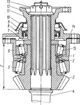 Рис. 188. Ведущая коническая шестерня главной передачи заднего моста: 1 - шайба регулировочная; 2 - втулка распорная; 3 - шестерня ведущая коническая; 4 - вал ведущий; 5, 15 - подшипники роликовые конические: 6 -стакан; 7 - шайба опорная; 8 - крышка стакана; 9 -манжета; 10 - отражатель; 11 - фланец ведущей шестерни; 12 - ø à é á à; 13 - ã à é ê à: 14 - ï ð î ê ë à ä ê à Для разборки главной передачи заднего моста выверните самоконтрящиеся болты крепления стопоров гаек подшипников дифференциала заднего моста и снимите стопоры 44 (рис. 186). Отогните стопорные пластины болтов крепления крышек подшипников дифференциала и выверните болты 45. Снимите крышки подшипников 43, регулировочные гайки 15 подшипников дифференциала и выньте дифференциал заднего моста. Расшплинтуйте и отверните гайку 49 крепления фланца заднего моста и снимите фланец 27. Выверните болты крепления крышки стакана подшипников ведущей конической шестерни, снимите крышку 30 и опорную шайбу 47. Выверните болты крепления крышки и снимите крышку 41. Выпрессуйте ведущий вал 38 в сборе с ведущей конической шестерней. Выверните болты крепления крышки и снимите крышку 8. Расстопо-рите и отверните гайку 11 и снимите опорную шайбу 10. Выньте стакан подшипников 7 в сборе с подшипником 9 и наружной обоймой подшипника 6. Снимите регулировочные шайбы 12 и выньте сборочную единицу ведомой конической шестерни. Для разборки дифференциала заднего моста спрессуйте внутренние кольца конических роликоподшипников 16 с чашкой 17 дифференциала. Для этого захваты 1 съемника (рис. 187) заведите за внутреннее кольцо подшипника и зафиксируйте винтами 3. Упираясь наконечником 2 в торец чашки дифференциала, ввертывайте винт 5 в траверсу 4 до полного снятия внутреннего кольца подшипника. Отверните самоконтрящиеся гайки крепления чашек дифференциала, выньте болты 22 (см. рис. 186), рассоедините чашки 17 дифференциала, выньте ведомую цилиндрическую шестерню 23, полуосевые шестерни 21, снимите опорные шайбы 19, 24, снимите сателлиты 18 с крестовины 20. Для разборки ведущей конической шестерни снимите стакан 6 (рис. 188) с подшипником 15, регулировочные шайбы 1 и распорную втулку 2. Выпрессуйте ведущий вал 4 заднего моста, спрессуйте съемником внутреннее кольцо конического роликоподшипника 5. Для снятия установите кромки клиньев 8 (рис. 189) между внутренним кольцом подшипника и шестерней и, ввернув винт 6 в траверсу 7, стяните их. Заведите захваты 1 за клинья 8 и зафиксируйте их в этом положении винтами 3. Упирая наконечник 2 в торец шестерни и вворачивая винт 3 в траверсу 4, снимите кольцо. Для разборки ведомой конической шестерни спрессуйте ведомую коническую шестерню 3 (см. рис. 186) вместе с цилиндрическим роликоподшипником 26. Выньте шпонку 4. Спрессуйте съемником внутреннее кольцо конического роликоподшипника 6 аналогично снятию внутреннего кольца подшипника ведущей конической шестерни (см. рис. 189). Разборка главной передачи промежуточного моста. Выверните болты крепления межосевого дифференциала и снимите межосевой дифференциал. Выверните самоконтрящиеся болты крепления стакана подшипников ведущей конической шестерни. Расшплинтуйте и отверните гайку 38 (рис. 190), снимите шайбу 39 и снимите фланец 37. Выверните болты крепления крышки и снимите крышку 34. Выньте задний вал 31 в сборе с подшипником 32. Разборка сборочных единиц ведомой конической шестерни и диффер