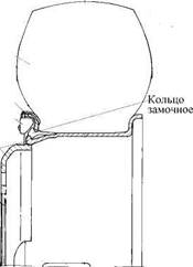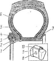 Рис. 214. Колесо с балансировочными грузами: 1 - обод колеса; 2 - кольцо замочное; 3 - кольцо бортовое; 4 - груз балансировочный в сборе; 5 - шина; 6 - камера; 7 - лента ободная; 8 - заклепка; 9 - груз балансировочный; 10 - пружина В