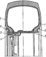 Рис. 224. Колесо с шиной в сборе: 1 — камера; 2 — бортовое кольцо; 3 — ободная лента; 4 — балансировочный груз; 5 — обод колеса; 6 — замочное кольцо; 7 — покрышка Рис. 225. Кран управления давлением воздуха в шинах: 1 — упорная шайба; 2—пружина клапана-ограничителя; — корпус крана; 7—распорное кольцо манжеты; 8—