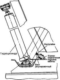 Рис. 263. Регулировка механизма подъема платформы самосвала Для регулирования угла подъема платформы автомобиля-самосвала: — отверните контргайку (см. рис. 263) регулировочного винта; —вверните регулировочный винт в шток до отказа; —поднимите платформу до положения, при кото —выверните регулировочный винт из штока кла те контргайкой. — расстопорите платформу, опустите и вновь — убедитесь, что подъем прекращается при совпа