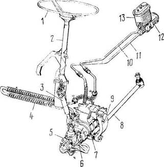Рис. 270. Управление рулевое: 1 - колесо рулевое; 2 -колонка; 3 - вал карданный; 4 - радиатор; 5 - клапан управления гидроусилителем; 6 - редуктор угловой; 7 -гидроусилитель с рулевым механизмом; 8 - тяга продольная; 9 - сошка; 10 - трубопровод низкого давления; 11 - трубопровод высокого давления; 12 -насос гидроусилителя руля; 13 - бачок гидросистемы повышает безопасность движения, позволяя сохранять контроль за направлением движения автомобиля в случае разрыва шины переднего колеса.
