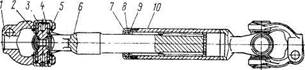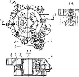 Рис. 276. Клапан управления гидроусилителем рулевого управления: 1 - плунжер глухого отверстия; 2, 5 - пружины; 3 - пробка резьбовая; 4 - клапан обратный; 6 - золотник; 7 - плунжер реактивный; 8 - корпус клапана; 9 - кольцо уплотнительное; 10 - клапан предохранительный подбор шариков и сборку шарико-винтовой пары. Поскольку передача осевого усилия от винта к гайке осуществляется посредством шариков, потери на трение в винтовой паре минимальны. Гайку после сборки с винтом и шариками устанавливают в поршень-рейку 15 и фиксируют двумя установочными винтами 9, которые закернивают в кольцевую проточку, выполненную на поршне-рейке. Поршень-рейка зацепляется с зубчатым сектором вала 10 сошки. Вал сошки вращается в бронзовой втулке, запрессованной в картер рулевого механизма и в алюминиевой боковой крышке 30. Толщина зубьев сектора вала сошки и поршня-рейки переменная по длине, что позволяет изменять зазор в зацеплении перемещением регулировочного винта 27, ввернутого в боковую крышку. Головка регулировочного винта, на которую опирается упорная шайба 25, входит в гнездо вала сошки. Осевое перемещение регулировочного винта в вале сошки, выдерживаемое при сборке равным 0, 02... 0, 08 мм, обеспечивается подбором регулировочной шайбы 26 соответствующей толщины. Детали 27, 26, 25 удерживаются в гнезде вала сошки стопорным кольцом 29. Средняя впадина между зубьями рейки, входящая в зацепление со средним зубом зубчатого сектора вала сошки, выполнена несколько меньшей ширины, чем остальные. Это необходимо для того, чтобы избежать заклинивания изношенного механизма после его регулирования при повороте вала сошки. На части винта рулевого механизма, расположенной в полости корпуса углового редуктора нарезаны шлицы, которыми винт сопрягается с ведомой шестерней угловой передачи. Клапан управления гидроусилителем рулевого управления (рис. 276) крепится к корпусу углового редуктора с помощью болта и четырех шпилек (или пяти шпилек — одной длинной и четырех коротких). Корпус 8 клапана имеет выполненные с большой точностью центральное отверстие и шесть (три сквозных и три глухих) расположенных вокруг него меньших отверстий. Золотник 6 клапана управления, размещенный в центральном отверстии, и упорные подшипники 22 (см. рис. 275) закреплены на винте гайкой 24, буртик которой вдавлен в паз винта 17. Под гайку подложена коническая пружинная шайба 23, обеспечивающая