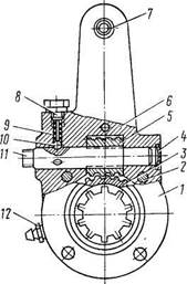 Рис. 286. Регулировочный рычаг: 1- крышка; 2 - заклепка; 3 - колесо зубчатое; 4 - заглушка; 5 - червяк; 6 - корпус; 7 - втулка; 8 - болт стопорный; 9 - пружина фиксатора; 10 - шарик фиксатора; 11 - ось червяка; 12 - масленка Автомобили КамАЗ