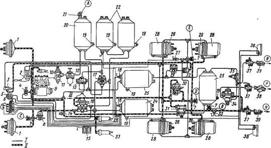 Рис. 287. Пневмопривод тормозных механизмов автомобиля мод. 5320: А - контрольный вывод контура IV; В, Е - клапаны контрольных выводов III контура; С - вывод контрольный контура I; D - вывод контрольный контура II; N - магистраль тормозная управляющая двухпроводного привода; Р - магистраль соединительная однопроводного привода; R -магистраль питающая двухпроводного привода; 1 - камеры тормозные типа 24; 2 - кран управления стояночной тормозной системой; 3 - кран аварийного растормаживания стояночной тормозной системы; 4 - кран управления вспомогательной тормозной системой; 5 - манометр двухстрелочный; 6 - лампы контрольные и звуковой сигнализатор; 7 - клапан контрольных выводов; 8 - клапан ограничения давления; 9 - компрессор; 10 - пневмоцилиндр привода рычага останова двигателя; 11 - регулятор давления; 12 - предохранитель от замерзания; 13 - клапан двойной защитный; 14 -датчик включения электромагнитного клапана тормозного механизма прицепа; 15 - батареи аккумуляторные; 16 - кран двухсекционный тормозной; 17 - клапан тройной защитный; 18 - датчик падения давления в ресивере; 19 - краны слива конденсата; 20 - ресивер конденсационный; 21 - клапан отбора воздуха; 22 - ресиверы контура II; 23 - пневмоцилиндр привода заслонки вспомогательной тормозной системы; 24, 25 - ресиверы I и III контуров; 26 - камеры тормозные типа 20x20; 27 - датчик включения контрольной лампы стояночной тормозной системы; 28 - энергоаккумуляторы; 29 - клапан ускорительный; 30 - регулятор автоматический тормозных сил; 31 - клапан управления тормозными механизмами прицепа с двухпроводным приводом; 32 - клапан двухмагистральный; 33 - датчик включения сигнала торможения; 34 - клапан управления тормозными механизмами прицепа с однопроводным приводом; 35 - клапан одинарный защитный; 36 - фонари задние; 37 - краны разобщительные; 38, 39 - соединительные головки типа А и типа " Палм"