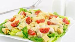 200 г куриного филе 100 г помидоров черри (или 1 обычный помидор) 50 г пармезана пучок салата (желательно сорта ромэн) половина белого батона 1 зубчик чеснока оливковое масло соль перец Заправка: 2 желтка 100 мл оливкового масла 3 ст.л. лимонного сока 1-2 зубчика чеснока 1-2 ч.л. горчицы соль
