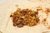 Нарезать мясо маленькими кусочками и обжарить на раскаленной сковороде до готовности не закрывая крышкой.Главное не пересушить мясо! Добавить мелко нарезанную морковь и лук. Немного потомить. Далее очистить и мелко нарезать баклажан.Добавить в мясо. Томить на огне до готовности.Блюдо поперчить, посолить и добавить приправы по вкусу. Все перемешать и дать еще немного потушиться. Отдельно обжарить картофель, нарезанный мелкими кубиками. Картофель — считаю лишним, но всем очень понравилось. Один лаваш нарезать на ленты, дабы ими завязать остальные лаваши.В развернутый лаваш добавить начинку. Лаваш завернуть и завязать. Поставить в духовку, разогретую до 160 градусов, на 20-30 минут. Вообще-то блюдо готово и без духовки, но после запекания, лаваш становится хрустящим.