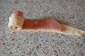 Ложные куриные ножки Для теста: -250г муки -кефир - 0, 75 стакана - 1 стакан (зависит от муки) -сода - 1/2 чайн.лож. -соли на кончике ножа -500 г куриного фарша (+1луковица, соль, перец черный по вкусу) -1пачка соломки соленой -растительное масло для жарки