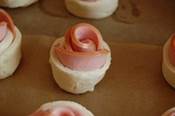 Колбасные " Розочки" - тесто слоеное бездрожжевое - колбаса вареная Тесто размораживаем, чуть раскатываем. Режем на полосочки (примерно 2 см). Колбаску тоненько режем и выкладываем половинки кругляшков колбаски. Кончики теста завернуть вниз розочки. Нижний край теста немного завертываем под низ розочки, формируя " бутончик". При желании тесто по бокам можно смазать разболтанным яйцом или желтком. Следить, чтобы смазка не попадала на края теста, т.к. это будет препятствовать расслоению теста при выпечке. Выкладываем " розочки" на застеленный бумагой противень и помещаем в духовку минут на 20 при температуре 180 С.