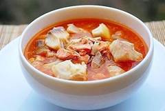 Филе сёмги или форели — 250 гр. Лук, нарезанный тонкими кольцами, обжарить с помидорами в томатной пасте, в кипящую воду положить нарезанный тонкой соломкой картофель и болгарский перец, через несколько минут добавить рыбу и варить до готовности. В конце положить обжарку, немного перца чили (по вкусу) и медленно влить взбитое яйцо. Подавать с гренками.
