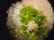 Нарежьте овощи. Нагрейте сливочное масло в сковороде. Обжарьте лук, сельдерей, чеснок и всыпьте рис. Тушите пока рис не начнет становиться коричневым (8-10 минут). Добавьте остальные ингредиенты и довдеите до кипения. Уменьшите огонь, закройте крышкой и на маленьком огне готовьте около 20 минут до готовности риса.
