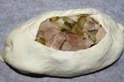 Лодочки из слоеного теста с картофелем, мясом и огурчиками