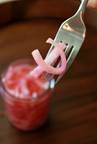 Маринованный красный лук. Отличное дополнение к жареному мясу или курице. Время приготовления: 10 минут 1 час на маринование 1/2 стакана яблочного уксуса 1 столовая ложка сахара (или меда) 1 1/2 чайной ложки соли 1 стакан воды 1 красная луковица, нарезанная полукольцами
