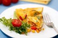 1. Картофель почистить, разрезать на половинки и нарезать очень тонко. Посыпать солью. 2. Почистить лук, разрезать на половинку и мелко порубить. Острым ножом нарезать помидоры. Влить 2 ст.л. оливкового масла в сковородку. Разогреть на среднем огне. 3. Добавить картофель и обжарить его в течении5 минут, постоянно помешивая. Добавить лук и хорошо перемешать. Накрыть сковородку крышкой и уменьшить огонь. Периодически помешивать. 4. Яйца разбить в большую миску и взбить вилкой, так чтобы смешать желтки и белки. Добавить соль и перец. 5. Когда картофель и лук будут готовы, добавить их в миску с яйцами. Добавить помидоры и горошек. Добавить оставшуюся ложку оливкового масла в сковородку и разогреть на среднем огне, приблизительно 1 минуту. 6. Влить смесь яиц и овощей в сковородку. Уменьшить огонь. Готовить на самом слабом огне 15 минут. 7. Когда почти вся жидкость на поверхности омлета испарится, перевернуть его на другую сторону и готовить еще 5 минут. Подавать горячим.