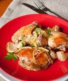 Ингредиенты (на 6 порций): - 1 курица весом около 2 кг (на фото сборная из крыльев и окорочков) - 1 крупный лимон - 4 маленьких луковицы (можно взять 2 средние) - 300 мл белого сухого вина - 1 ч.л. сухого тимьяна - 1 головка чеснока - соль по вкусу