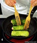 1. Листья капусты отварить в подсоленной воде в течение 5 минут. Отваренные листья вынуть из воды, утолщенные жилки вырезать или аккуратно отбить, листья высушить. 2. Сосиски освободить от оболочки, с краев сделать небольшие крестообразные надрезы глубиной 4-5 мм. 3. Края отваренного листа капусты подогнуть так, чтобы получился пласт, ширина которого чуть меньше длины сосиски. В подготовленный капустный лист завернуть сосиску, начиная с основания листа. Таким же образом приготовить остальные рулетики. 4. В сковороде разогреть растительное масло и слегка обжарить в нем капустные рулетики со всех сторон. Затем рулетики уложить в сковороду на некотором расстоянии друг от друга. 5.Для приготовления соуса лук очистить и нарезать дольками. Спассеровать его в растительном масле до прозрачности (не допуская поджаривания), добавить сметану, соль и перец по вкусу и слегка прогреть. Затем посыпать соус мукой и тщательно перемешать. 6. Приготовленный соус выложить в промежутки между рулетиками, влить немного воды, в которой варились капустные листья, добавить лавровый лист и тушить под крышкой в течение 5-7 минут. При подаче капустные рулетики посыпать рубленой зеленью.