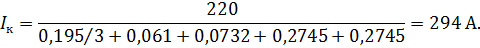 3. Сечения проводов. S Ф1 = 30мм2; S Н1 = 25 мм2; сечение фазного провода определяется по номинальному току двигателя S Ф2 = 4 мм2 (алюминий). Это же сечение принято и для нулевого защитного провода S Н1 = 4 мм2. 4. Определение активных сопротивлений фазных и нулевых защитных проводников. R Ф1= 1, 2 R Н1= 1, 2 R Ф2= 1, 2·0, 0305·30 / 4 = 0, 2745 Ом; R Н2= 0, 2745 Ом. Индуктивными сопротивлениями моно пренебречь (провода из цветного металла). 5. Z Т= 0, 195 Ом; 6. Тогда в соответствии с формулой (5) определяется ток короткого замыкания:
