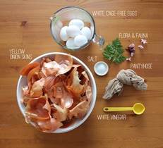 луковая шелуха (с луковиц около 10-15 шт, в зависимости от того, сколько яиц вы красите) белые яйца немного соли (для предотвращения разрушения оболочки) 1 столовая ложка уксуса (чтоб не лопнули яйца) старые колготки разные листики и цветочки на ваш выбор, убедитесь, что ни один из его ядовит (в данном случае использовались листья вишни и папоротника).