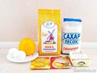 200 г муки 130 г сахара 100 г масла 2 яйца 1 большой апельсин (150 мл сока + цедра) 1 ч. л. ванильного сахара 1 ч. л. с горкой разрыхлителя