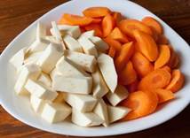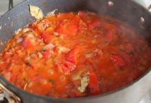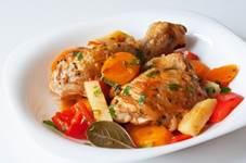 1 целая курица весом около 1, 9 кг или соответствующее количество окорочков 3 моркови 2-3 луковицы 2 крупных сладких перца 1 пастернак или репка (около 350 г) 60 мл белого сухого вина или воды 800 г томатов в собственном соку 3 лавровых листа 1 ч.л. сухого тимьяна 1 ч.л. сухого орегано 3 ст.л. нарубленной петрушки соль и перец по вкусу растительное масло для жарки