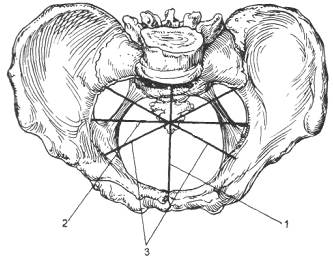 рис. 2. Размеры плоскости входа в малый таз. 1 – прямой размер (истинная конъюгата); 2 – поперечный размер; 3 – косые размеры. Плоскость входа в малый таз проходит через верхневнутренний край лонной дуги, безымянные линии и вершину мыса. В плоскости входа различают следующие размеры (рис. 2). Прямой размер— кратчайшее расстояние между серединой верхневнутреннего края лонной дуги и самой выдающейся точкой мыса. Это расстояние называется истинной конъюгатой (conjugata vera); она равняется 11 см. Принято также различать и анатомическую конъюгату — расстояние от середины верхнего края лонной дуги до той же точки мыса; она на 0, 2—0, 3 см длиннее истинной конъюгаты (см. рис. 1). Поперечный размер — расстояние между наиболее отдаленными точками безымянных линий противоположных сторон. Он равен 13, 5 см. Этот размер пересекает под прямым углом истинную конъюгату эксцентрично, ближе к мысу. Косые размеры— правый и левый. Правый косой размер идет от правого крестцово-подвздошного сочленения до левого подвздошно-лонного бугорка, а левый косой размер — соответственно от левого крестцово-подвздошного сочленения до правого подвздошно-лонного бугорка. Каждый из этих размеров равен 12 см. Как видно из приведенных размеров, плоскость входа имеет поперечно-овальную форму. Плоскость широкой части полости малого таза проходит спереди через середину внутренней поверхности лонной дуги, с боков — через середину гладких пластинок, расположенных под ямками вертлужных впадин (lamina acetabuli), и сзади — через сочленение между II и IIIкрестцовыми позвонками. В плоскости широкой части различают следующие размеры. Прямой размер— от середины внутренней поверхности лонной дуги до сочленения между II и IIIкрестцовыми позвонками; он равен 12, 5 см. Поперечный размер, соединяющий наиболее отдаленные точки пластинок вертлужных впадин той и другой стороны равен 12, 5 см. Плоскость широкой части по своей форме приближается к кругу. Плоскость узкой части полости малого таза проходит спереди через нижний край лонного сочленения, с боков — через седалищные ости, сзади — через крестцово-копчиковое сочленение. В плоскости узкой части различают следующие размеры. Прямой размер— от нижнего края лонного сочленения к крестцово-копчиковому сочленению. Он равен 11 см. Поперечный размер— между внутренней поверхностью седалищных остей. Он равен 10, 5 см. Плоскость выхода малого таза в отличие от других плоскостей малого таза состоит из двух плоскостей, сходящихся под углом по линии, соединяющей седалищные бугры. Она проходит спереди через нижний край лонной дуги, по бокам — через внутренние поверхности седалищных бугров и сзади — через верхушку копчика. В плоскости выхода различают следующие размеры. Прямой размер— от середины нижнего края лонного сочленения до верхушки копчика. Он равен 9, 5 см. Прямой размер выхода благодаря некоторой подвижности копчика может удлиняться в родах при прохождении головки плода на 1—2 см и достигать 11, 5 см (см. рис. 1).