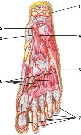 Тыльная артерия стопы дает медиальные и латеральные предплюсневые артерии (aa. tarseae mediales et laterales) (рис. 230), принимающие участие в образовании тыльной сосудистой сети стопы. Также от нее отходит дугообразная артерия (a. arcuata), разветвляющаяся на четыре тыльные плюсневые артерии (aa. metatarsae dorsales) (рис. 230), каждая из которых, в свою очередь, делится на две тыльные пальцевые артерии (aa. digitales dorsales), поставляющие кровь к тыльным поверхностям II–V пальцев стопы. Концевыми ветвями тыльной артерии являются первая тыльная плюсневая артерия (a. metatarsea dorsalis prima), разветвляющаяся на тыльные пальцевые артерии, две из которых снабжают кровью I палец, а одна — медиальную поверхность II пальца, и глубокая подошвенная ветвь (r. plantaris profundus), выходящая через первый межкостный промежуток на подошвенную поверхность стопы и принимающая участие в образовании подошвенной дуги (arcus plantaris).