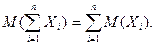 4. Закон распределения полностью характеризует случайную величину. Иногда о случайной величине достаточно знать не весь закон распределения, а лишь некоторые числа, которые описывают случайную величину обобщенно. Такие числа называются числовыми характеристиками случайной величины. Важнейшей числовой характеристикой случайной величины является математическое ожидание. 4.1. Свойства математического ожидания: 1) математическое ожидание постоянной равно этой постоянной M(C)=C (2.6) 2) постоянный множитель можно выносить за знак математического ожидания М(СХ) = С • М(Х) (2.7) 3) математическое ожидание суммы случайных величин равно сумме математических ожиданий слагаемых