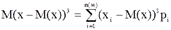 Значение М(х - М(х))3 - называется центральным моментом третьего порядка. Замечание. Для характеристики асимметрии вполне достаточно вычислить М(х-М(х))3, но эта величина дает кубические единицы измерения, что неудобно в практике. Путем деления на σ 3 достигается безразмерность числа характеризующего наличие асимметрии. Причем, если аx< 0, т.е. когда М(х-М(х))3< 0, то скос наблюдается справа, если ах> 0, т.е. когда М(х - М(х))3 > 0, то скос наблюдается слеза., если ax=0, т.е. когда М(х-М(х))3> 0, то распределение симметрическое. Если случайная величина дискретная, то