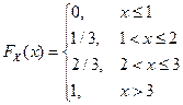 Функцией распределения случайной величины X называется функция FX(x), определенная для любого действительного х и выражающая вероятность того, что случайная величина X примет значение, меньшее х: FX(x)=P(X< x). Функция распределения обладает следующими свойствами: 1. Для любого 2. Функция распределения является неубывающей функцией, то есть, если FX(x1) ≤ FX(x2), если х2< х1. 3. Вероятность того, что случайная величина примет значение из полуинтервала [x1, x2), равна разности значений функции распределения на концах интервала, то есть P(x1£ X< x2)=FX(x2)-FX(x1). 4. Если возможные значения случайной величины расположены на всей числовой прямой, то справедливы следующие предельные соотношения 5. Функция распределения непрерывна слева, то есть 6. Справедливо равенство: P(X³ x)=1-FX(x). Задача 2. Построить функцию распределения FX(x) для случайной величины X из задачи 1. Решение. Случайная величина X имеет три значения 1, 2, 3, которые делят всю числовую ось на четыре интервала: Если 1< x≤ 2, то неравенство X< x возможно только если X=1, а вероятность такого события равна 1/3, поэтому для таких x функция распределения FX(x)=1/3. Если 2< x≤ 3, неравенство X< x означает, что или X=1, или X=2, поэтому в этом случае вероятность P(X< x)=P(X=1)+P(X=2)=2/3, т.е. FX(x)=2/3. И, наконец, в случае x> 3 неравенство X< x выполняется для всех значений случайной величины X, поэтому P(X< x)=P(X=1)+P(X=2)+P(X=3)==1, т.е. FX(x)=1. Итак, мы получили следующую функцию: