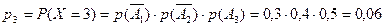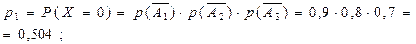 Пример 2. Рабочий обслуживает три станка. Вероятность того, что в течение часа первый станок не потребует регулировки – 0, 9, второй – 0, 8, третий – 0, 7. Составить закон распределения числа станков, которые в течение часа потребуют регулировки. Решение. Случайная величина X – число станков, которые в течение часа потребуют регулировки, может принимать значения 0, 1, 2, 3. Для нахождения соответствующих им вероятностей введем события: