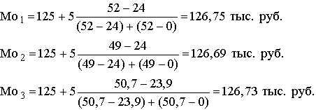 где ХMo – нижнее значение модального интервала; Для нашего примера можно рассчитать три модальных значения исходя из признаков числа предприятий, объема продукции и суммы затрат. Во всех трех случаях модальный интервал один и тот же, так как для одного и того же интервала оказываются наибольшими и число предприятий, и объем продукции, и общая сумма затрат на производство: