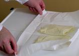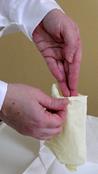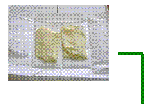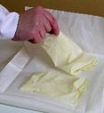 | Вскрыть верхнюю упаковку на разовых стерильных перчатка и достать внутреннюю упаковку. Разложить внутреннюю паковку. Перчатки лежат ладонной поверхностью к верху, а края перчаток отвернуты кнаружи в виде манжет
