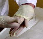 | 3. Большим и указательным пальцем правой руки захватить изнутри отвернутый край левой перчатки и осторожно натянуть ее на руку