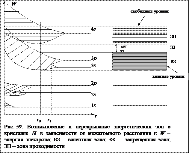 Рассмотрим энергетическую структуру полупроводников и диэлектриков на при мере типичного полупроводника — кристаллического кремния (Z = 14), электронная формула которого . При образовании кристаллической решетки, начиная с некоторого межатомного расстояния r 1 > r 0 (r 0 – равновесное межатомное расстояние в кристалле) происходит sp 3-гибридизация электронных состояний кремния, что приводит не просто к перекрыванию 3 s и 3 р зон, а к их слиянию и образованию единой 3 sp 3 гибридной валентной зоны (рис. 59), в которой максимально возможное число электронов 8 N. В кристаллическом кремнии каждый атом образует 4 тетраэдрические связи, достраивая свою валентную оболочку до восьми электронов. Вследствие этого в валентной зоне все 8 N состояний заняты. Таким образом, у полупроводников и диэлектриков зона, образованная уровнями валентных электронов — валентная зона (ВЗ) — полностью заполнена. Следующая вакантная 4 s -зона не перекрывается с валентной зоной при межатомном расстоянии r 0 , а отделена от нее зоной запрещенных энергий (ЗЗ). Электроны, находящиеся в валентной зоне участвовать в проводимости не могут, так как все состояния в зоне заняты. Для того, чтобы в кристалле появился ток, необходимо перевести электроны из валентной зоны в следующую свободную зону разрешенных энергий. Первая свободная разрешенная зона, расположенная выше валентной зоны, называется зоной проводимости (ЗП). Энергетический промежуток между дном зоны проводимости и потолком валентной зоны называется шириной запрещенной зоны Wg.
