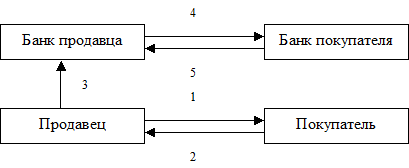 Рисунок 10.5 Простейшая схема инкассовой операции Основными видами расчетных операций являются инкассовые, аккредитивные, переводные, конвертационные. Инкассовые операции – зачисление денег на счет клиента на основании предоставленных ним расчетных документов (чеков, векселей, платежных требований). Рассмотрим рисунок 10.5.Продавец отправляет товар в адрес покупателя (1), который расплачивается чеком, выписанным своему банку (2). Продавец передает чек в свой банк (3), который в свою очередь выставляет требование об оплате чека банку покупателя (4). Со счета покупателя в его банке списывается сумма, указанная в чеке, которая зачисляется на счет продавца в его банке (5). Аккредитивные операции – операции гарантии поставщику оплаты товаров покупателем.
