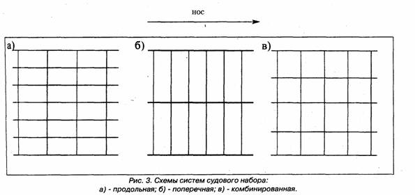Набор судна. Продольный набор. Назначение деталей продольного набора, способы соединения их. Поперечный набор. Крепление деталей поперечного набора к продольному. Смешанный набор корпуса. Безнаборные конструкции корпуса. Набор корпуса, системы набора. Основные понятия и термины. Конструкция корпуса должна обеспечивать водонепроницаемость и достаточную прочность судна. Корпус, испытывая действие сил собственного веса судна и сил давления воды, которые распределяются по длине неравномерно, может получить изгиб. Способность судна сопротивляться изгибающим нагрузкам называется продольной прочностью. Кроме продольного изгиба судна, под действием давления воды, груза, механизмов и другого судового оборудования возникает местная деформация днища, бортов и настила в поперечном направлении. Способность судна противостоять усилиям, вызывающим деформацию корпуса в поперечном направлении, называется поперечной прочностью. При чрезмерных нагрузках может произойти разрушение корпуса. Чтобы этого не случилось, листы обшивки подкрепляют набором – продольными и поперечными балками. Совокупность продольных и поперечных балок, образующих каркас судна, называется судовым набором корпуса. Набор корпуса судна, являясь каркасом, делается из наиболее прочных материалов. Состоит он из продольных и поперечных связей. Основной продольной связью является киль, установленный в диаметральной плоскости судна. У деревянных судов он представляет собой прочный брус из крепких пород дерева (дуб, ясень и т. п.), а у металлических — утолщенную полосу металла. В носовой части судна непосредственно к килю присоединяется форштевень. Это загнутый кверху брус или металлический угольник, являющийся продолжением киля. Подобный брус или угольник, но установленный в кормовой части, называется ахтерштевнем. У деревянных судов форштевень и ахтерштевень, как и киль, изготовляют из прочных пород дерева. Кормовая часть моторных судов обычно заканчивается транцем. Он представляет собой раму из брусков дерева твердых пород, обшитую снаружи досками или фанерой. Транец надежно крепится к килю. Для судов с подвесными моторами транцы должны быть повышенной прочности, так как они воспринимают упор гребного винта и вибрацию работающего двигателя. Продольные и поперечные балки судового набора располагаются в определенной последовательности, называемой системой набора. В зависимости от соотношения продольных и поперечных балок системы набора подразделяются на: продольную, поперечную и комбинированную (рис.3) .